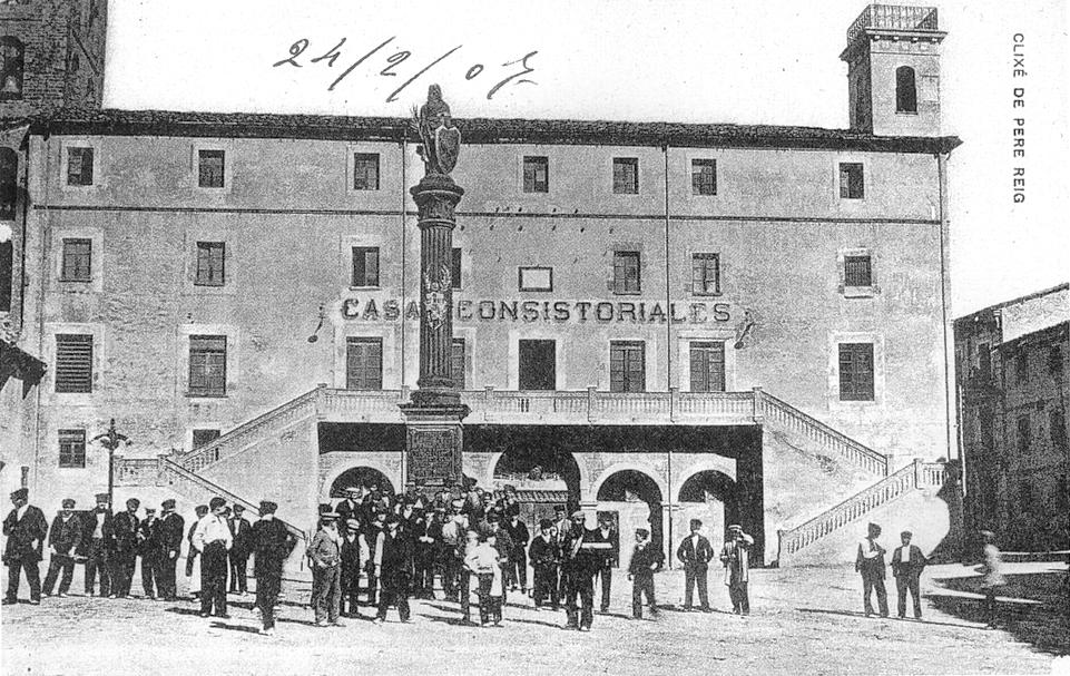 | Vista de Ripoll. Plaza del ayuntamiento entre 1897 y 1906. El monumento fue erigido en recuerdo a los ripolleses que defendieron la villa del ataque carlista producido el 27 de mayo de 1839 |